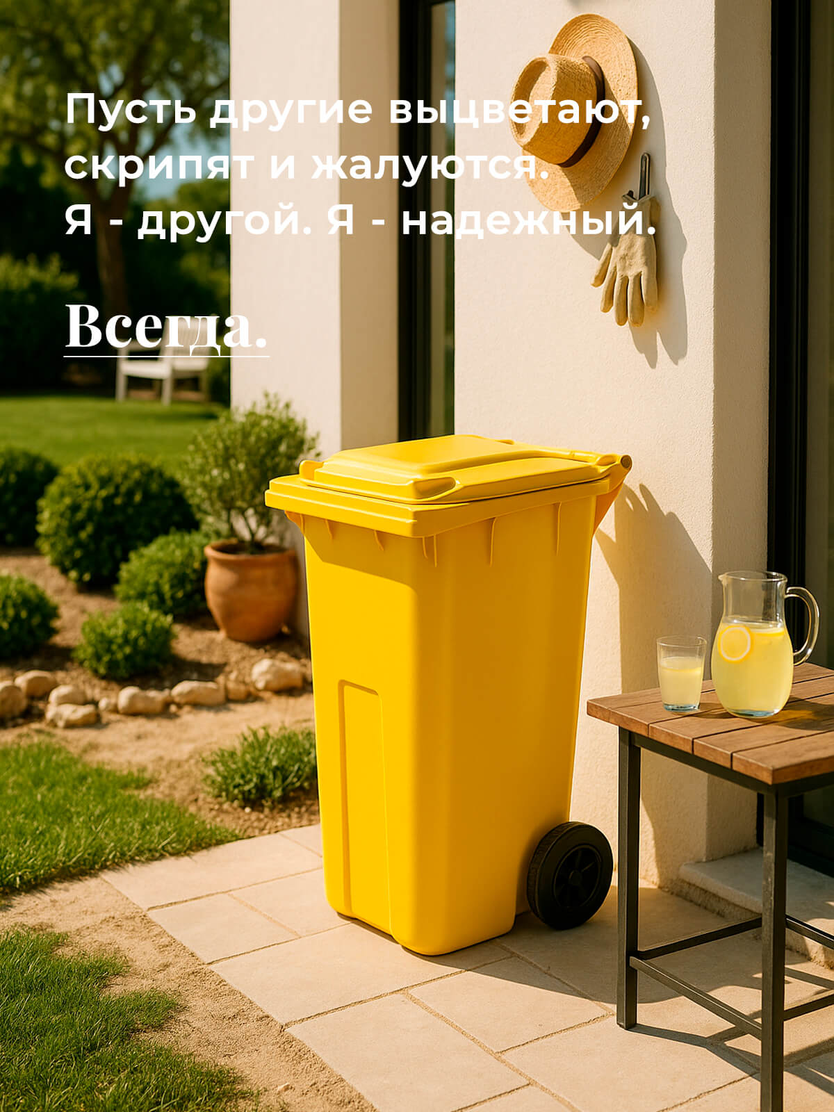 Благодаря прочным колёсам контейнер легко перемещается по любой поверхности. Корпус из первичного ПНД выдерживает морозы, удары и воздействие ультрафиолета, а плотная крышка надёжно удерживает запахи и защищает от осадков.